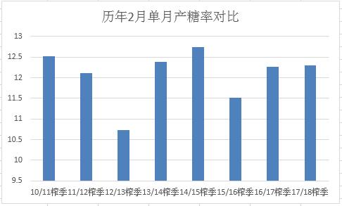 从统计对比的数据看,1-2月份广西天气和光照影响,2月单月产糖率同比基本持平,产糖率增幅有限。此外,春节糖厂开工率下降,产能利用率偏低也是影响因素之一。但是2月单月产糖率环比增加0.5%,主要是进入2月甘蔗更加成熟和糖分基本稳定刺激产糖率增加。