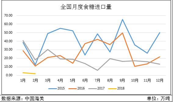 据中国糖协数据,截至2月底,2017/2018年制糖期全国已累计产糖736.69万吨,上制糖期同期产糖715.67万吨,同比增产21.02万吨,增长率不足3%。离预期相比全国增产将近11%还有不少差距,其主要原因是广西开榨推迟,产能还没跟上。截至2月28日,2017/2018榨季广西全区累计产糖448.8万吨,上制糖期同期产糖产糖454万吨,同比减少5.2万吨,但广西预期是增产13%—15%。因此,预期广西3月、4月产量同比将大幅增加。广西南宁站台现货报价2月共下调100元/吨,截至3月26日,3月累计已下调150元/吨。