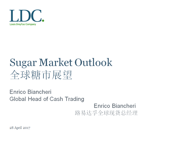 广西糖网28日讯  中国(昆明)糖业高峰论坛及中国糖业协会商业流通会员座谈会4月28日在昆明召开,在下午的会议上,路易达孚国际现货贸易经理恩里.科比昂盖里发表了《全球与巴西糖业展望》的主题发言。发言全文如下: