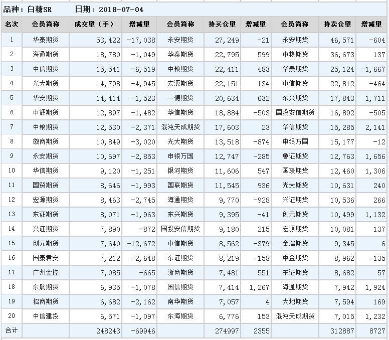7月4日郑州白糖持仓排行表