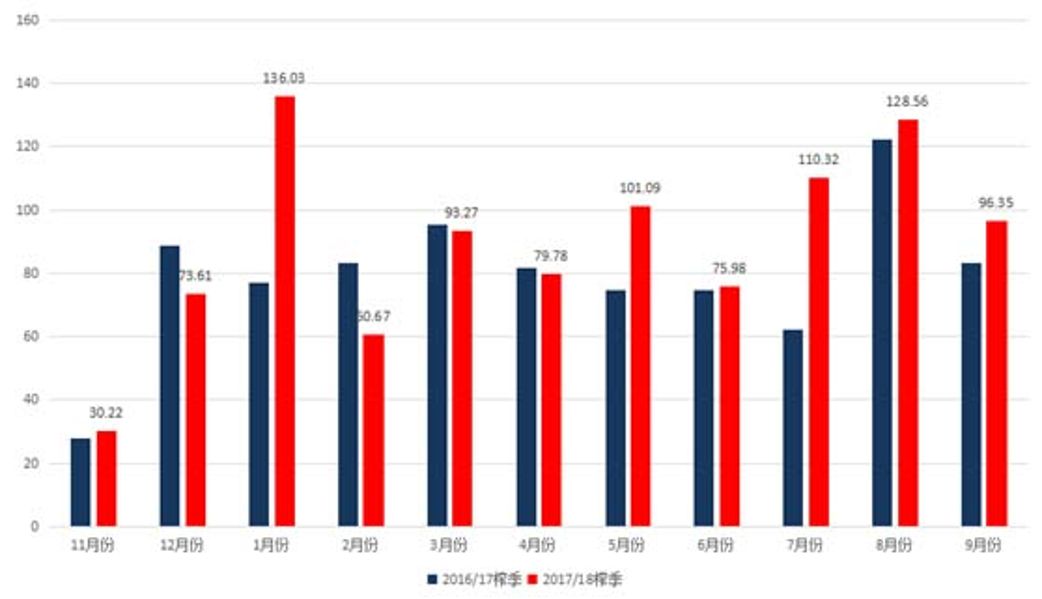2017/18榨季全国产糖1031.04万吨,从月底销售看12月份销量较少,加之春节前采购高峰,在此情况下1月份销量剧增,为此也消耗了2月份的销售空间,2月份销售量仅60.67万吨。整体看,两榨季单月销售量呈现了季节性特点,对比两榨季各月销量,5-9月份2017/18榨季各月销量均好于上榨季同期。