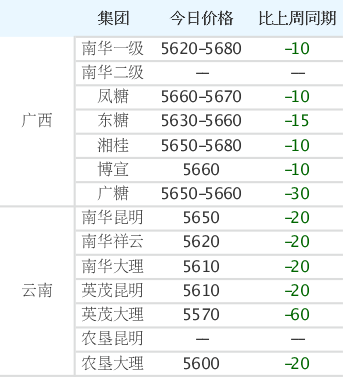 本周,主产区集团现货报价整体同比上周小幅下调10-20元/吨,仅广西广糖集团同比上周下调报价30元/吨,云南英茂大理同比下调了60元/吨。周一主产区集团现货报价仍同比上周小幅上调,周二便是理性下调报价的开始,下调节奏持续到周四后停止,周四五现货报价基本持平。