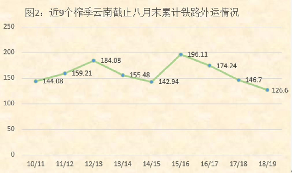 图2所示, 近9个榨季以来,云南截止八月末累计铁路外运量最多的榨季是2015/16榨季的196.11万吨,2018/19榨季的126.6万吨创下近9个榨季以来的新低。