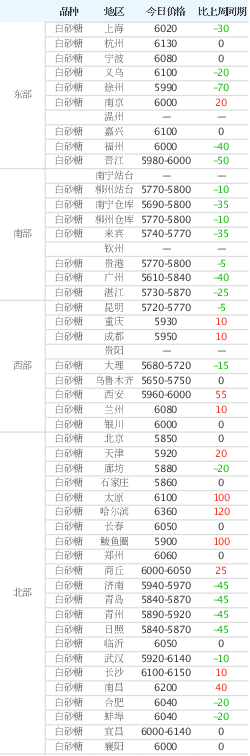 由于以上原因,周一我国现货报价同比上周五基本持平,仅云南产区部分集团报价同比上调10元/吨,销区仅北部部分中间商报价上调10-40元/吨。不过,虽然周二仍有部分现货报价小幅上调,但我国新榨季的开榨,新糖即将入市,消息表示国家即将放储以及进口糖补充市场等利空因素同样对现货市场造成影响,在期价大幅下跌的情况下,周三至周五我国现货报价也开始了回调的步伐,但同比上周下调幅度不大。