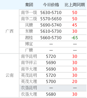 虽然本周前期我国产区集团现货报价持续上调,但由于市场供需压力影响,短期内产区集团现货报价暂时企稳于5600-5700元/吨左右,从报价情况来看,目前云南产区集团现货报价在5700元/吨左右,要稍高于广西产区集团;目前广西82家糖厂已全部开榨,云南则仍有部分糖厂尚未开榨。因此,最终本周我国产区集团报价为5570-5740元/吨,环比上周上调20-50元/吨。