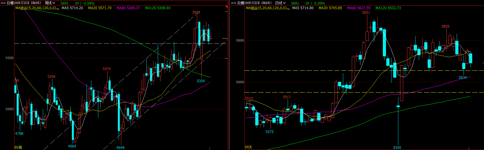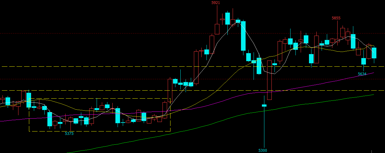 国内方面广西整体收榨提前,至今日收榨45家,云南、海南、广东也在不断生产,短期库存对于糖价仍存在压力;近日全国各地陆续复工,运输在缓慢恢复,近期产区现货销量有所增加,下游消费也会缓慢恢复,疫情影响有望缓慢好转,一定程度上支撑国内糖价。但目前疫情仍在继续,产区供应增加、下游消费很难马上好转,短期糖价缺乏有力支撑。技术走势图看SR005(图五)周线周期保持上升趋势,在5921高位遇阻回调;日线周期,价格回调5650一带反弹,陷入5650-5850区间震荡,但上涨成交缩量、下跌成交放大,短期价格或有扩大震荡区间的可能,参考支撑5630、5480,参考压力5770、5850。