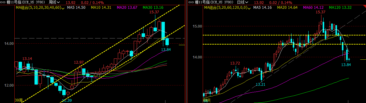 近期ICE:ICE原糖期货(图三)近期呈现下跌走势。昨日CRB指数大幅上涨,但原糖却背道而行,ICE指数下跌0.26美分/磅,跌幅达1.83%;对于原糖下跌有外电消息称,因新型冠状病毒疫情影响降低投资者风险偏好,基金削减多头仓位所致。整体看,ICE原糖指数(图二)创15.37高位后回落,震荡下行,目前跌破短期上升趋势线、跌破14.20-14.70区间支撑,短期价格仍有继续回调可能。