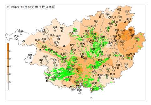图2 2019年9-10月广西无雨日数分布图(绿色区域为甘蔗植区)