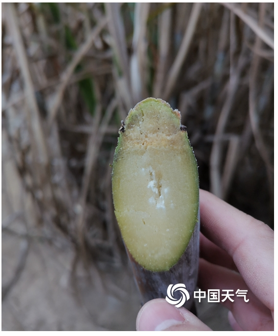 据气候监测数据显示,贵港市2020年10月16日至2021年1月6日的总降雨量12.3毫米,仅有历年同期的1成。贵港市糖料蔗的生长受气象干旱的影响出现了棉芯,影响较重的甘蔗叶子已全部枯黄,植株矮小,茎直只有1毛钱硬币大小。