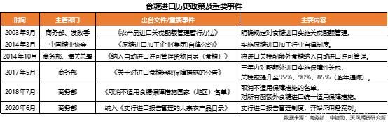 2003年9月商务部、国家发展改革委发布《农产品进口关税配额管理暂行办法》(商务部、国家发展和改革委员会令2003年第4号),其中第三条明确规定我国食糖需实施进口关税配额管理制度,商务部每年9月底出台第二年的食糖进口关税配额申请和分配细则。