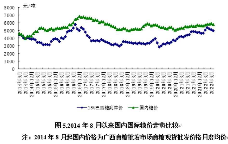 2.国内糖价为广西食糖批发市场食糖现货批发价格均价(2014年8月起)