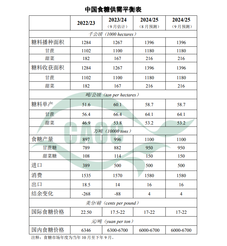 本月对中国食糖供需形势预测数据不作调整。2023/24年度制糖期即将结束,截至8月底,全国累计销糖886万吨,同比增长9.6%;累计销糖率88.9%,同比放缓1.2个百分点。广西、广东、海南等甘蔗主产区受台风“摩羯”影响,局地甘蔗倒伏、折断;内蒙古甜菜主产区近期降雨,不利于糖分积累,具体影响程度需跟踪评估。新旧年度交替,陈糖持续去库存,市场采购以刚需为主,糖价弱势震荡。国际方面,巴西中南部地区受干旱天气影响预期产糖量下降,印度放开甘蔗乙醇生产限制,并计划延长食糖出口禁令,对国际糖价有一定支撑作用。