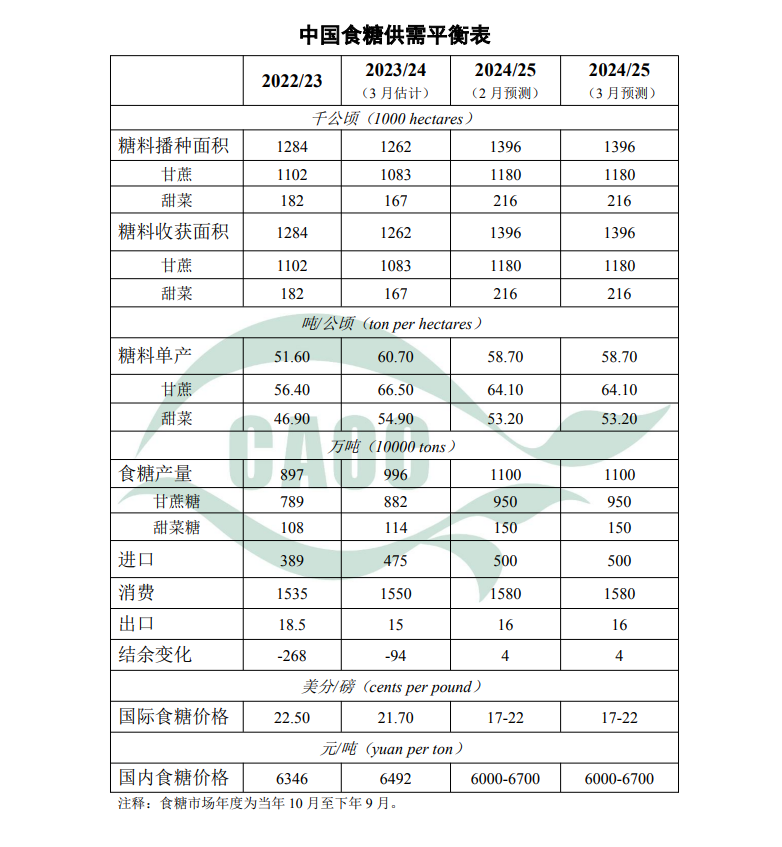 本月对中国食糖供需形势预测数据不作调整。2024/25年度食糖生产已进入尾声,北方甜菜糖厂全部停机,南方甘蔗糖厂陆续收榨。据中国糖业协会统计,截至2025年2月底,全国累计产糖972万吨,同比增177万吨;累计销糖475万吨,同比增97万吨;销售进度48.9%,同比加快1.4个百分点。2月底广西、云南等地迎来持续降雨,旱情解除利于甘蔗生长,后期还需继续关注天气变化。国际方面,巴西食糖产量较上年度减少,印度产量不及预期,国际产需缺口扩大。