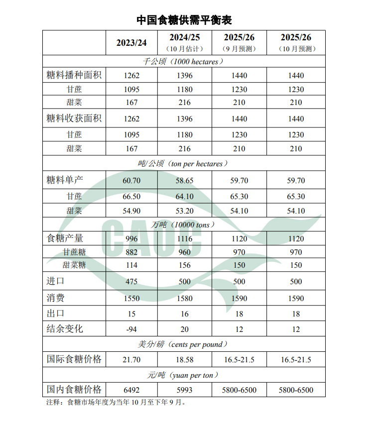 2024/25年度中国食糖产销结束,累计产糖1116万吨,较上年度增加120万吨;食糖年度均价为每吨5993元,在预测范围内,比上年度每吨跌498元,跌幅7.7%;国际原糖年度均价为每磅18.58美分,在预测范围内,比上年度每磅下跌3.1美分,跌幅14.3%。本月对2025/26年度中国食糖供需形势预测与上月保持一致。8月份内蒙古降雨偏多,不利于甜菜糖分积累及起收,糖厂开机时间推迟,对甜菜糖产量的影响需进一步跟踪评估。9月底10月初广东、广西等甘蔗主产区受台风影响,出现甘蔗倒伏等现象,后期需持续关注灾后甘蔗生长恢复情况。