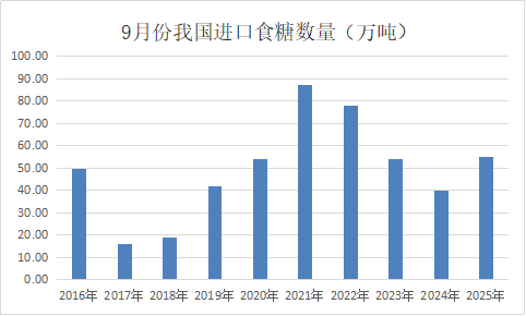 据海关总署公布的数据显示,2025年9月我国进口食糖55万吨,同比增加15万吨,为近十年同期第三高的水平。其中白糖3万吨,原糖51.76万吨。