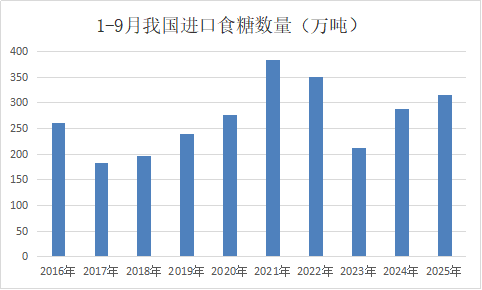 2025年1-9月我国累计进口食糖316万吨,同比增加27万吨,继续保持在近十年同期第三高的水平。其中白糖22.55万吨,原糖292.81万吨。2024/25榨季我国累计进口食糖463万吨,同比减少12万吨。