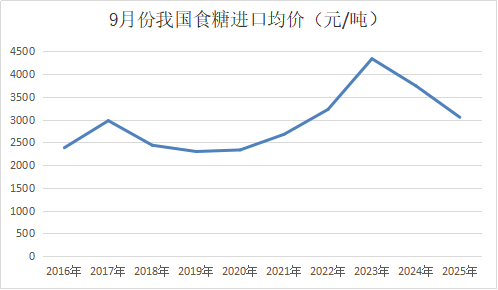 9月份我国进口食糖均价为3054元/吨(到岸价),同比下降691元/吨,继续刷新近四年同期最低水平。