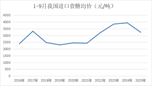 2025年1-9月我国进口食糖均价为3239元/吨(到岸价),同比大幅下降699元/吨,不过仍然是近十年同期第四高的水平,今年以来累计食糖进口均价逐月下降。