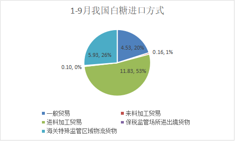 2025年1-9月我国进口食糖316万吨,其中白糖23万吨,进口方式主要是进料加工贸易11.83万吨,占比53%,其次是海关特殊监管区域物流货物5.93万吨,第三是一般贸易只有4.53万吨;进口原糖293万吨,大部分183.65万吨通过一般贸易进口,占比63%,其次89.45万吨为保税监管场所进出境货物,占比30%,还有19.36万吨海关特殊监管区域物流货物,占比7%。9月份进口的约52万吨原糖大部分28万吨通过一般贸易进口,另外新增16万吨保税监管场所进出境货物,还有约7万吨海关特殊监管区域物流货物。