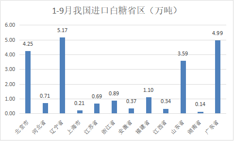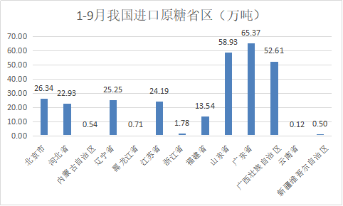 9月份进口的约52万吨原糖大部分28万吨通过一般贸易进口,另外新增16万吨保税监管场所进出境货物,还有约7万吨海关特殊监管区域物流货物。其中广东16万吨、广西15万吨、山东8万吨、江苏7万吨、北京3万吨,其他省区基本没有新增进口。具体情况如下: