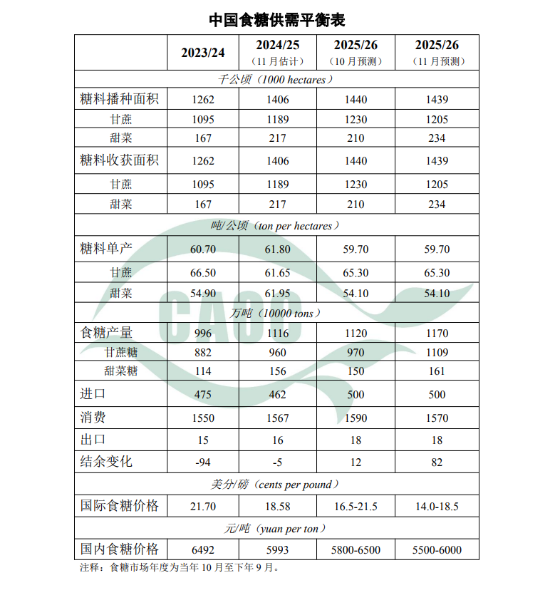 本月对2024/25年度中国食糖供需数据进行了校正,主要是将食糖进口量下调38万吨至462万吨。本月预测,2025/26年度中国食糖产量1170万吨,比上月预测上调50万吨,主要是因为全国糖料种植面积小幅增长,南方甘蔗整体长势良好,北方甜菜含糖分略增,食糖总产量略高于预期;食糖消费1570万吨,比上月预测下调20万吨。南方甘蔗糖厂已开机生产。北方29家甜菜糖厂已全部开机,生产形势总体平稳。国际食糖均价下调至每磅14.0-18.5美分,主要是受巴西、印度、泰国等主产国增产预期影响。后期需关注主产国天气、国际贸易政策等情况。