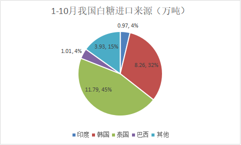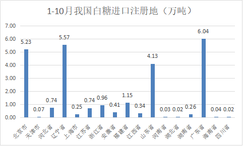 10月份进口的约71万吨原糖其中北京20万吨、广东18万吨、辽宁9万吨、天津8万吨、山东7万吨、广西6万吨,还有内蒙古和黑龙江也有1.5-2.5万吨。