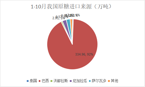 2025年1-10月我国进口食糖390万吨,其中白糖25.96万吨,从泰国进口最多11.97万吨,其次是韩国8.26万吨,第三从印度和巴西各进口约1万吨保持不变;进口原糖363.96万吨,其中从巴西进口最多334.96万吨,占比高达92%,其次从萨尔瓦多和尼加拉瓜各进口9-9.6万吨不变,还有2.91万吨、2.4万吨分别从洪都拉斯和泰国进口,10月份进口的约71万吨原糖仍然几乎全部来自巴西。