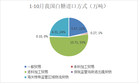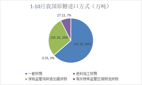 10月份进口的约71万吨原糖大部分47万吨通过一般贸易进口,另外新增16万吨保税监管场所进出境货物,还有约8万吨海关特殊监管区域物流货物。