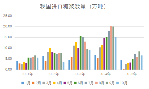 海关总署公布的数据显示,2025年10月份我国进口糖浆、预混粉合计11.55万吨,同比减少11.05万吨,在近五年同期当中继续保持中等水平。其中进口糖浆三项合计6.73万吨,同比大幅减少8.58万吨;进口预混粉两项合计4.82万吨,同比减少2.47万吨。