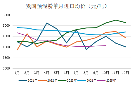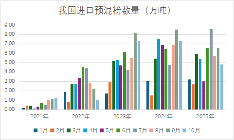 2025年1-10月我国17029012项下进口预混粉9.57万吨,大部分9.28万吨通过一般贸易进口,还有0.28万吨保税监管场所进出境货物;同期21069062项下进口预混粉42.94万吨,大部分42.71万吨也是通过一般贸易进口,还有0.12万吨海关特殊监管区域物流货物。