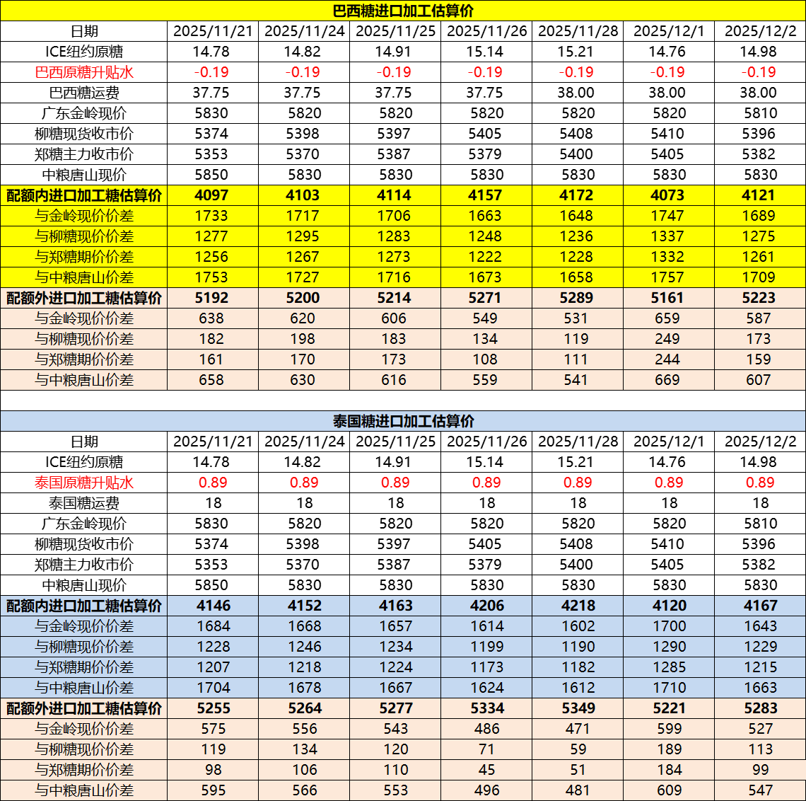 巴西泰国进口糖升贴水、运费及加工成本(12月3日更新)