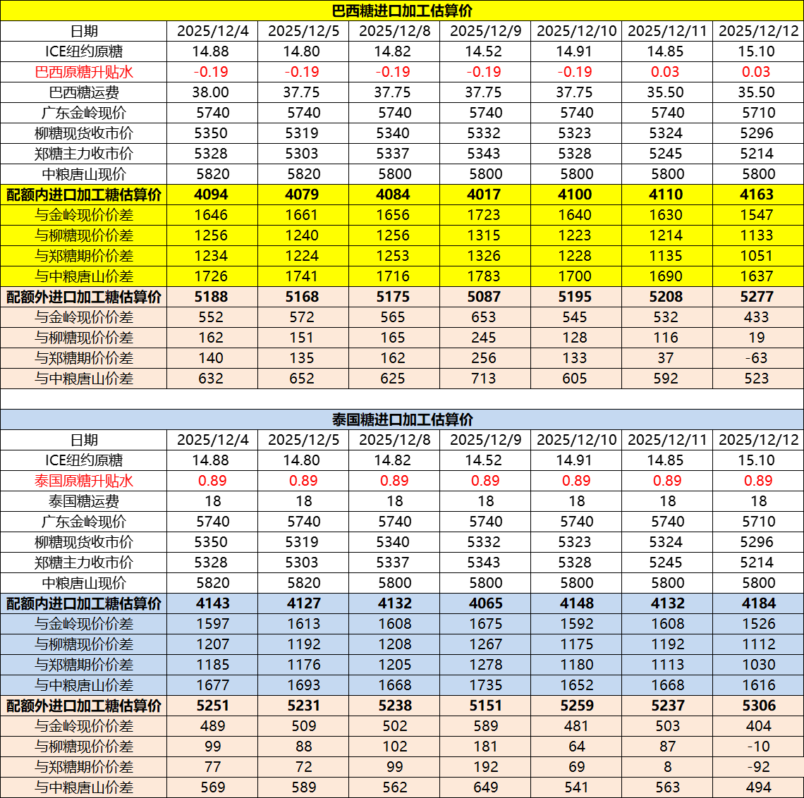 巴西泰国进口糖升贴水、运费及加工成本(12月15日更新)
