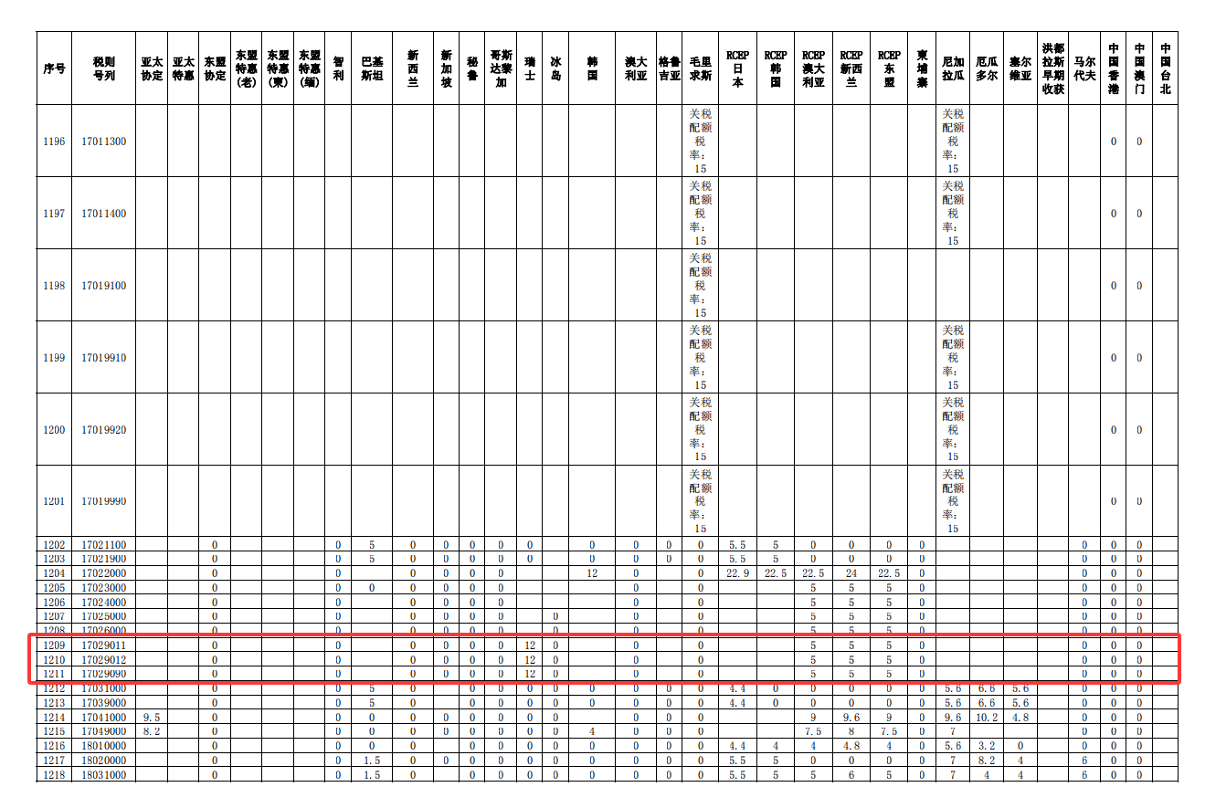 二、1702项下糖浆、预混粉自由贸易协定和优惠贸易安排实施税率