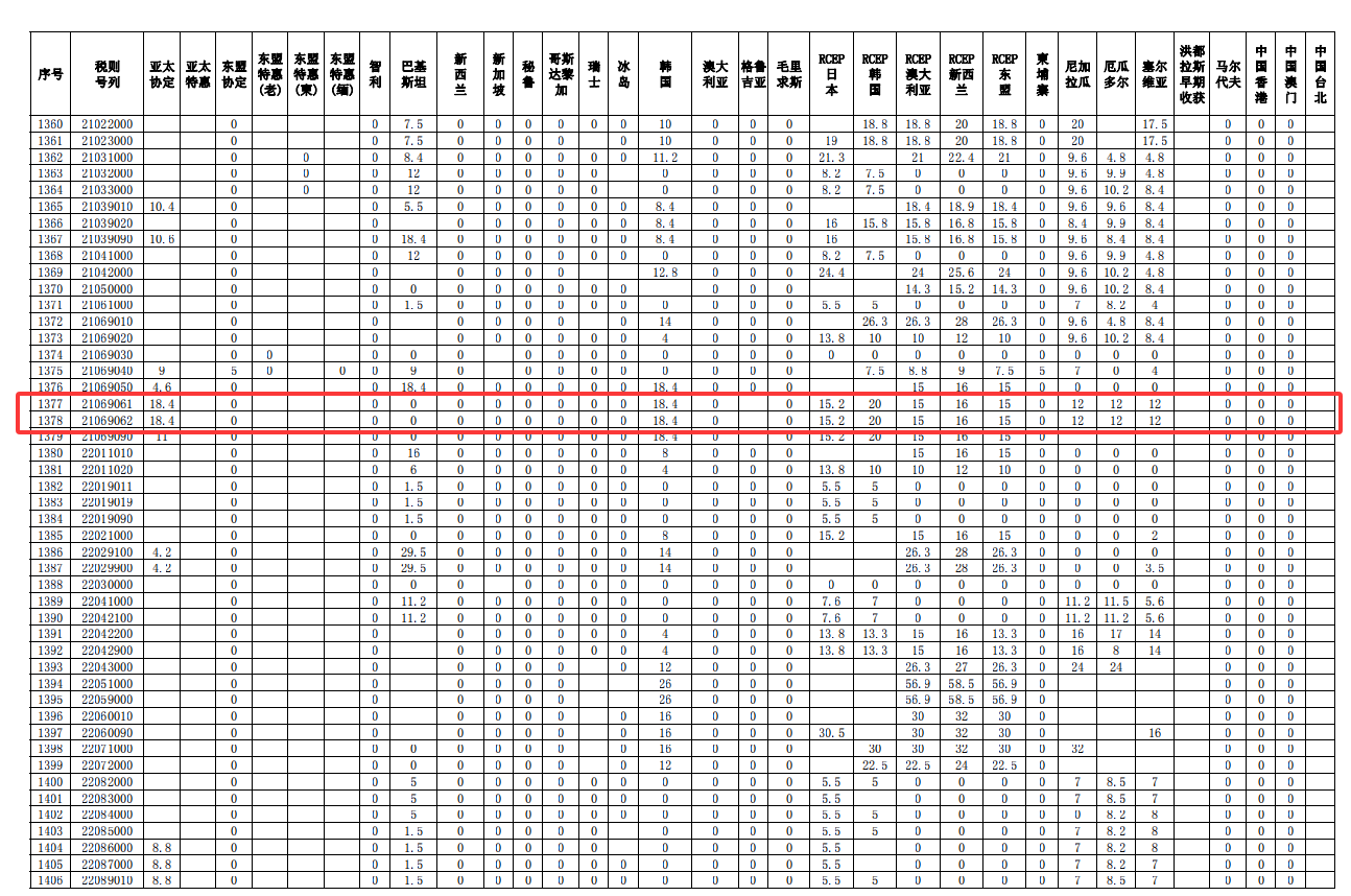 三、2106项下糖浆、预混粉自由贸易协定和优惠贸易安排实施税率