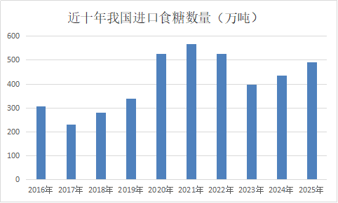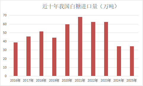 2025年我国累计进口白糖34.41万吨,同比略减0.14万吨,为近十年最低水平,与高峰时间相比几乎减少一半,近两年我国白糖进口数量均处于低位。