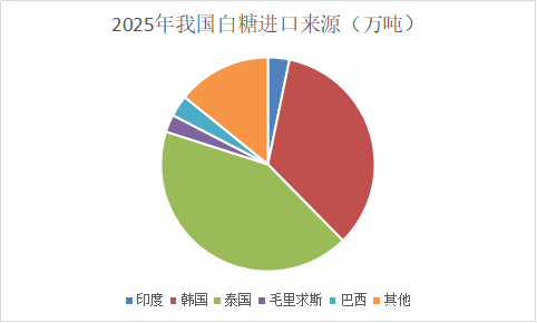 2025年我国进口食糖492万吨,其中白糖34.41万吨,从泰国进口最多14.56万吨,其次是韩国11.83万吨,第三从印度、巴西和毛里求斯各进口约1万吨;进口原糖457.15万吨,其中从巴西进口最多428.04万吨,占比高达93%,其次从萨尔瓦多和尼加拉瓜分别进口9万吨、9.57万吨,还有2.4万吨、2.91万吨分别来自泰国和洪都拉斯,12月份进口的约53万吨原糖仍然几乎全部来自巴西。