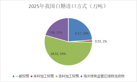 2025年我国进口食糖492万吨,其中白糖34.41万吨,进口方式主要是进料加工贸易18.52万吨,占比54%,其次是一般贸易8.17万吨,占比24%,第三是海关特殊监管区域物流货物7.08万吨,占比21%;进口原糖457.15万吨,大部分277.62万吨通过一般贸易进口,占比61%,其次143.12万吨为保税监管场所进出境货物,占比31%,还有35.62万吨海关特殊监管区域物流货物,占比8%。