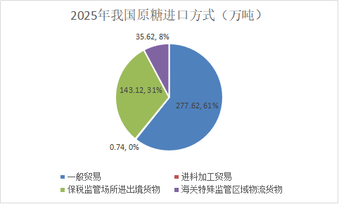 2025年我国通过一般贸易进口原糖277.62万吨,同比减少5.57万吨;通过保税监管场所进出境货物进口原糖143.12万吨,同比大增51.48万吨,也是近三年最高水平。