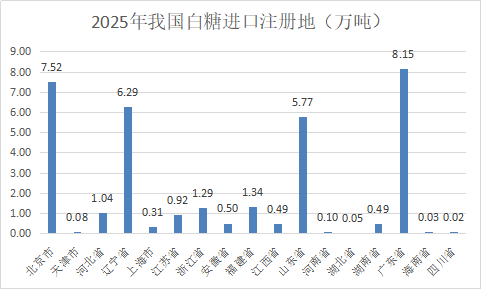 2025年我国累计进口食糖492万吨,其中白糖34.41万吨,进口量最大的为广东8.15万吨,第二是北京7.52万吨,第三为辽宁6.29万吨,第四为山东5.77万吨;进口原糖457.15万吨,其中山东进口量跃升至第一93.11万吨,其次是广东90.56万吨,北京进口量跃升至第三79.34万吨,第四为广西59.07万吨,第五为辽宁41.47万吨,第六为江苏36.19万吨,还有河北27.31万吨。