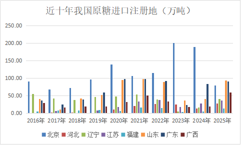 回顾近十年我国原糖进口注册地变化,2025年有一个很明显的特点是北京进口数量锐减,相比去年减少了一半还多,基本是2019年以来最低水平;相应的是其他省区进口量同比均呈现不同程度增长,大部分同比增幅翻番,特别是广西原糖进口量达到近十年来最高水平。