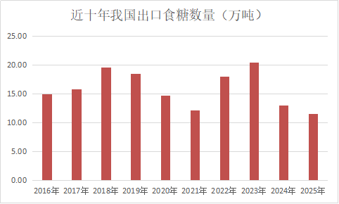2025年我国累计出口食糖11.59万吨,同比减少1.4万吨,为十年来最低水平。