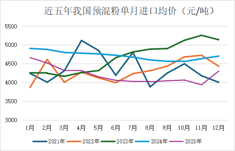 12月份我国进口预混粉两项合计0.63万吨,进口均价4303元/吨,虽然同比下降399元/吨,仍然处于近五年同期第二低的水平,但是环比大增,折糖价约4890元/吨。