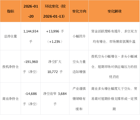 截至 2026 年 1 月 20 日,CFTC 原糖交易商持仓补充报告数据显示,市场持仓结构呈现 “投机净空小幅扩张、商业端净空收窄” 的特征,多空博弈仍显胶着,资金对后市方向尚未形成明确共识: