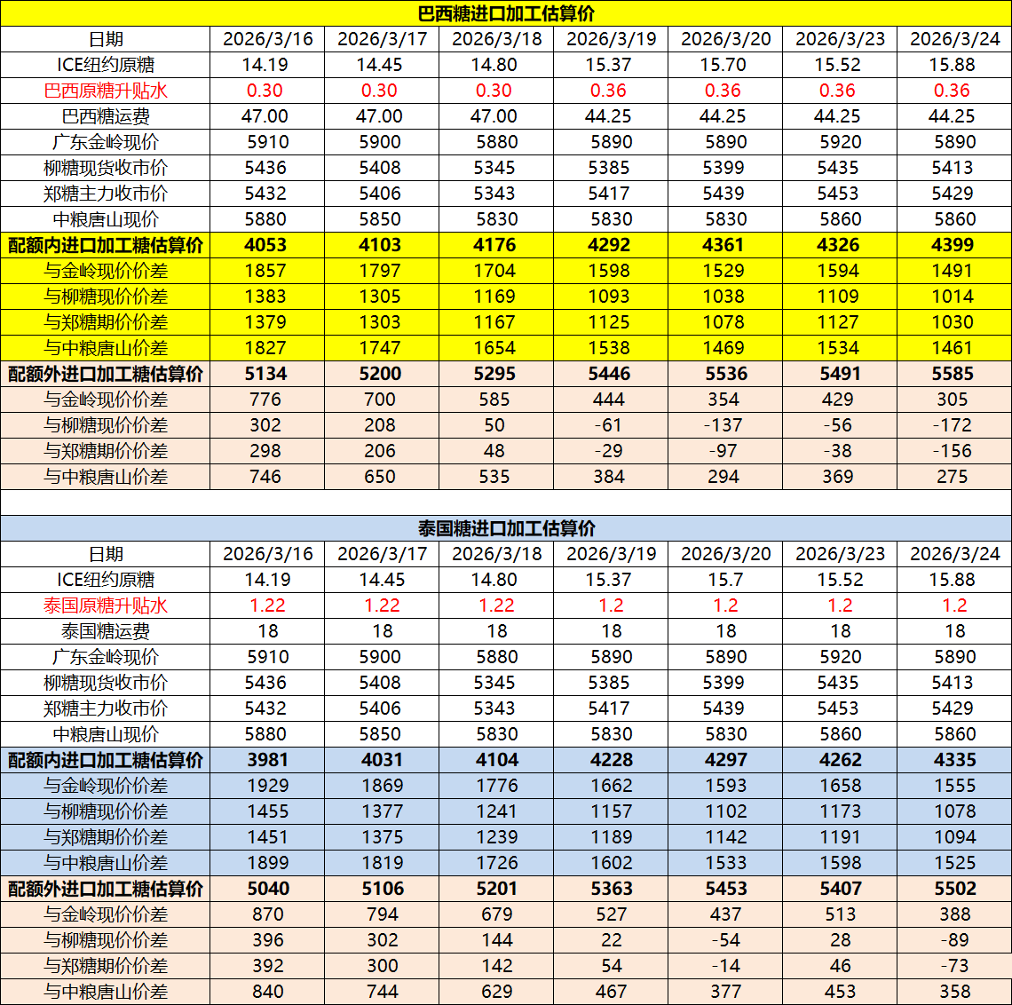 巴西泰国进口糖升贴水、运费及加工成本(3月25日更新)