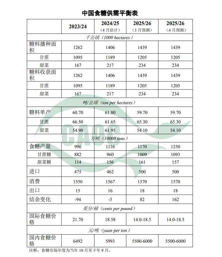 本月对2024/25年度中国食糖供需平衡表不作调整,将2025/26年度中国食糖产量预测值上调80万吨至1250万吨,主要是广西、云南等主产区甘蔗长势较好,产糖率处于历史较好水平,产糖量高于预期。截至3月底,广西、云南累计产糖分别为740.7万吨、213.4万吨。从生产进度看,北方甜菜糖厂已全部结束生产;南方甘蔗糖主产区广西已进入收榨阶段,云南生产预计持续至5月末。国际方面,2025/26年度巴西、印度、泰国等主产国普遍增产,国际食糖供需仍维持宽松态势。后期需持续关注中东地区局势演变、全球原油市场波动以及巴西2026/27年度甘蔗制糖比变化等因素对国际国内食糖市场的影响。