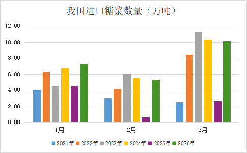 2026年1-3月我国进口糖浆、预混粉合计26.51万吨,同比增加7.1万吨。其中进口糖浆22.74万吨,折糖15.24万吨;进口预混粉3.77万吨,折糖3.32万吨。25/26榨季截至3月底我国进口糖浆、预混粉合计56.46万吨,同比减少26.87万吨。