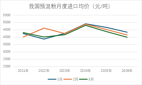 2026年3月份我国进口预混粉2.12万吨,进口均价3991元/吨,同比下降421元/吨,折糖价约4536元/吨,也刷新了近六年同期最低水平。