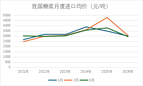 2026年3月份我国进口糖浆10.17万吨,进口均价2943元/吨,同比下降841元/吨,创近六年同期最低水平,折糖价约4392元/吨。