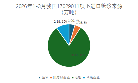 2026年1-3月我国17029011项下进口糖浆22.41万吨,其中从老挝进口最多18.18万吨,其次为马来西亚2.18万吨,第三为印尼和缅甸均为1万吨左右;同期21069061项下已经基本没有糖浆进口。