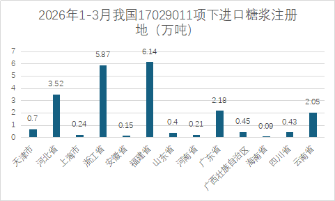 2026年1-3月我国17029011项下进口糖浆22.41万吨,其中进口量最大的是福建6.14万吨,其次是浙江5.87万吨,第三是河北3.52万吨,然后是广东、云南2.18万吨、2.05万吨。